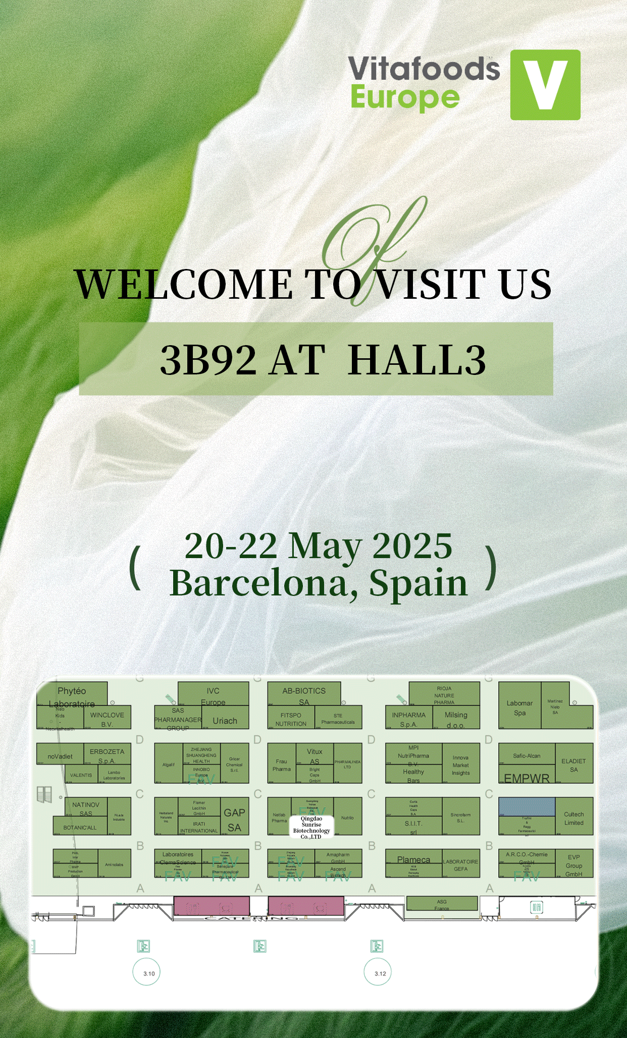 We are honored to inform you that Qingdao Sunrise Biotechnology Co., Ltd will once again embark on an international journey and participate in Vitafoods Europe, which will be held in Barcelona, Spain from May 20th to 22nd, 2025.